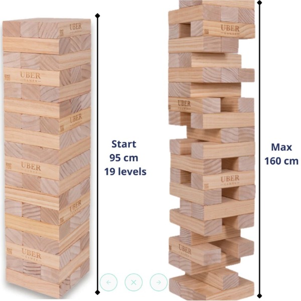 Jenga XXL bestaat uit extra grote houten blokken waarmee je een toren kunt bouwen van maximaal 160 cm hoog. De regels blijven hetzelfde: haal om de beurt een blok uit de toren en leg die bovenop zonder dat hij instort. Perfect voor jong én oud!