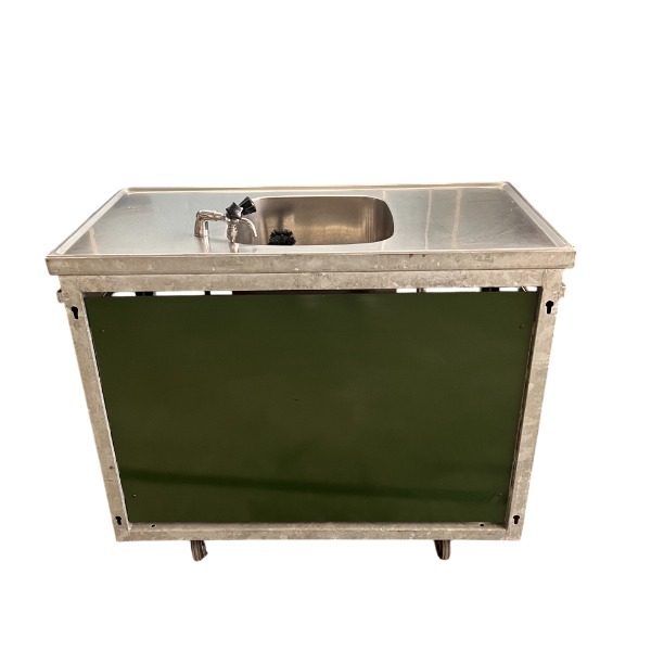 De mobiele spoeltafel is voorzien van een spoebak, een werkblad en praktische opslagruimte onderaan. Dankzij de verrijdbare constructie is de tafel eenvoudig te verplaatsen, waardoor ze perfect inzetbaar is bij catering, foodtrucks, festivals en outdoor events.